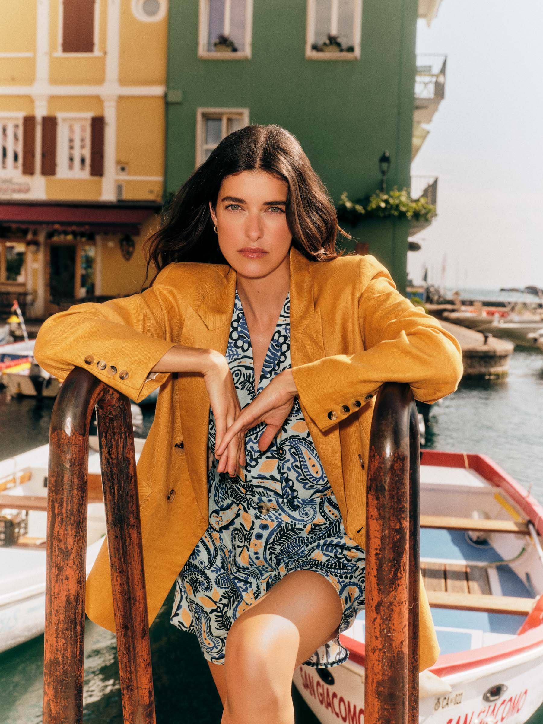 Leichtigkeit, Sonne auf der Haut und ein Hauch Bella Italia: Inspiriert von der mühelosen Eleganz von Marie Nasemann bringt diese 3/4-Arm Bluse sommerliche Lässigkeit in jeden Look. Gefertigt aus 100 % GOTS-zertifiziertem Bio-Leinen, sorgt das Material für ein angenehm kühles, atmungsaktives Tragegefühl – perfekt für warme Tage. Der leicht verkürzte, moderne Schnitt trifft auf einen V-Ausschnitt mit kleinem Revers, der dem Design eine feminine Note verleiht. Mit ihren 3/4-Ärmeln ist die Bluse ein unkompliziertes Lieblingsstück – solo getragen oder als Set mit Rock oder Hose im passenden Print.